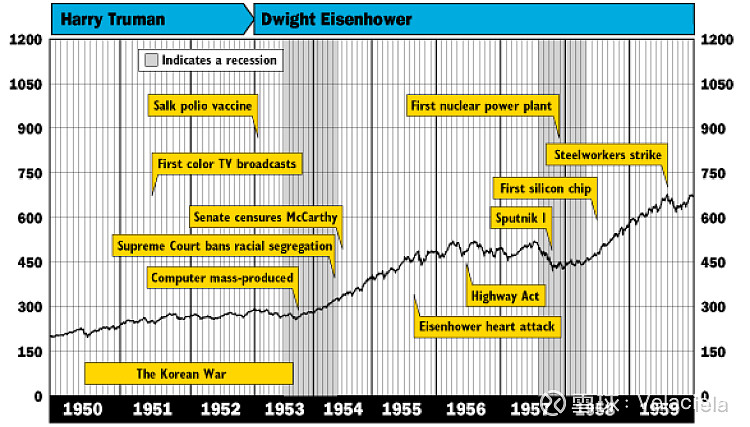 1950年代美股整体处于牛市中,但牛市幅度一般。大盘从不到300点涨到600多点,10年翻了一倍,不能算是超级大牛市。
