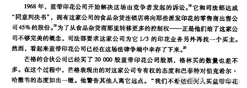 在巴菲特的传记中,有这么一段关于蓝带印花的反垄断案的描述。当然这个描述非常模糊。通过查找其他资料,我可以大概还原当时的情况。